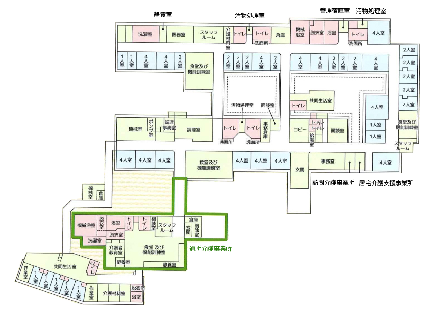 常時の介護を必要とし、自宅で介護を受けることが困難な方(原則として要介護3以上の方)が入浴、排泄、食事等の介護、相談及び援助、日常生活上の支援、健康管理を受けることができます。明るく楽しい生活が送れるよう環境づくりを行っています。
